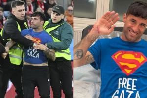 在今天凌晨的世界杯欧洲区预选赛,挪威主场5-0大胜以色列。比赛中有一名球迷冲进球场,脱下外套,展示自己所穿的写着“自由加沙”口号的T恤。比赛因此被短暂中断,直到安保人员将其控制住。